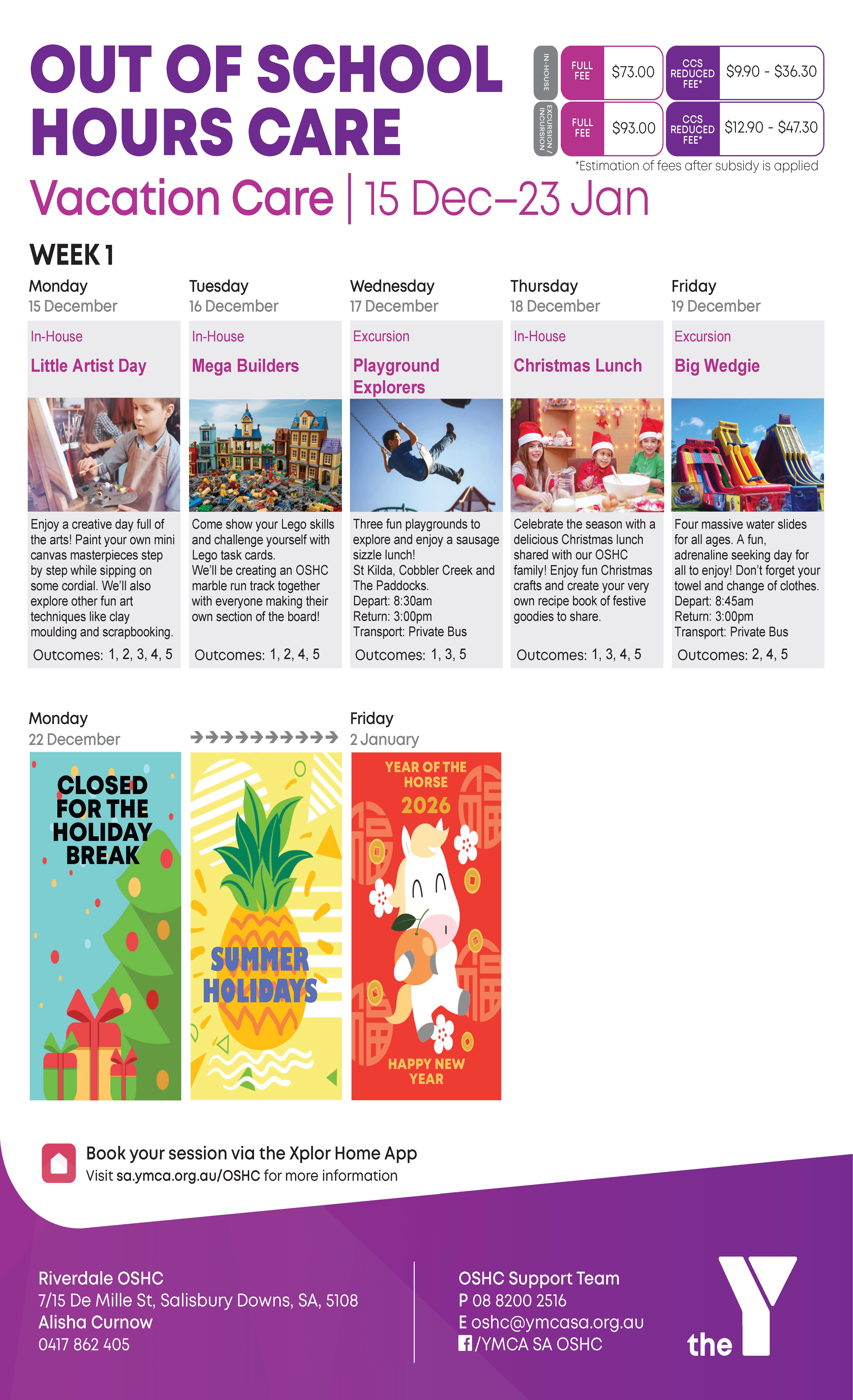 *No fees will be charged if a medical certificate is provided to oshc@ymcasa.org.au no later than 5 business days from the date of missed service.